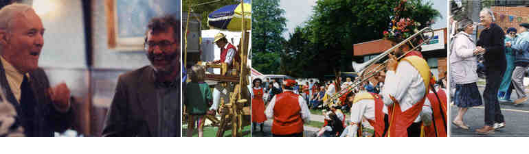 above: Tony Benn sharing a joke with Festival Director Philip Freeman in Newtown Council Chamber, Ian Orr woodturning with a pole lathe on the Festival Field, Knockhundred Shuffles, a couple from Tennessee dancing to Cajun music (last two pictures outside Oriel Davies Gallery).
