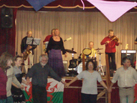vibrancy of traditional theatre to our usual diet of music, dance and song. In the hall Diane and Jackie and the rest of the Llandinam Lilliputs Playgroup made it look fabulous and gave us some wonderful food and drink with which to celebrate. TASC trustees Pam and Pete organised a display of some of our Severn Suite dances, with Peter and Matt involved in playing the music. Our other trustees Linda and Kathleen were singing with the Wild Angels led by Sue Harris. Linda returned to sing with Sirens and Matt and Pete re-appeared with the Klezmonauts. Philip did duty as MC and called a few dances to music played by the Llandinam Village Band this time led by Rees Wesson. Not only did Gwyn do the reading in church for us but ran the bar, assisted by Village Hall chairman Mike. Thanks to Rick for a spine-tingling rendition in the church, and to Andy Warren for sharing the calling,and thanks to all the other musicians and dancers who took part, to Vivien and Paul for help in preparation and backstage work and to all those people who came and made it such a very special evening. This was another true celebration of our own rich heritage. |